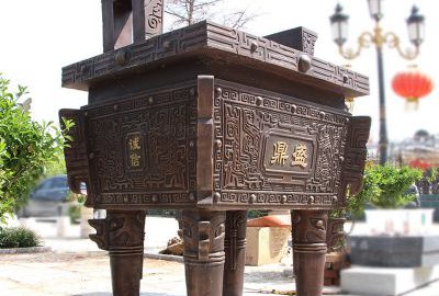中國最著名的青銅鼎是鑄造于商朝的司母戊大方鼎,重量大約08噸,現在陳列于國家博物館內。在濟寧大運河北岸,四足四方鼎雕塑,也有一個青銅鼎,名為任城寶鼎。此鼎高度為506米,重量為8噸,大約是商朝司母戊大方鼎的十倍。任城寶鼎旁邊有一個巨大的書籍型的石刻,根據這個石刻上的文字介紹,這個鼎是目前世界上最大的青鑄造四足四方鼎雕塑。